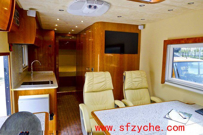 六驅(qū)越野房車車身內(nèi)整體豪華配置:在駕駛室中還有主流卡車中配備的天窗通風系統(tǒng)和后排折疊床板,這款越野房車的后排內(nèi)部具有地板加熱系統(tǒng),獨立的會客廳,高級絨布真皮座椅具備多項可調(diào)功能,雖然包裹感不是很強,但卻有一定的支撐性,更加符合越野房車的特質(zhì)。此外,中央空調(diào)、天窗與側(cè)窗外加頂部迎賓燈的點綴是恰到好處,前后對著的兩臺大尺寸液晶電視方面中央四位乘客觀看。在門口的兩側(cè),分別是吧臺和迷你廚房,電磁爐、微波爐、冰箱應有盡有。車門頂部設有整車電路控制面板,可通過開關控制燈光、車門等等。干濕分離的衛(wèi)生間分別分布在客廳旁與臥室中,其中一間設有浴盆和真空馬桶,另一間則配有恒溫淋浴,走廊的盡頭就是這間臥室,其擁有電控臥室門,獨立中央空調(diào)、屋內(nèi)整體照明系統(tǒng)與液晶電視,此外整間臥室采用了實木裝潢,超寬的雙人床鋪足夠車主享用。