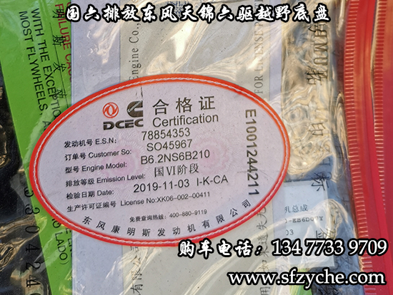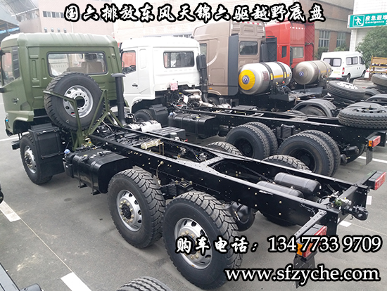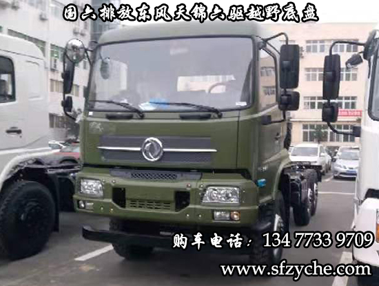 國(guó)六排放東風(fēng)天錦六驅(qū)越野底盤,東風(fēng)天錦D530一排半駕駛室,6×6驅(qū)動(dòng),康明斯B6.2NS6B210國(guó)六發(fā)動(dòng)機(jī)210馬力,最大扭矩:850N.m/1100-1700rpm,排量6.2L、韶齒手動(dòng)六檔變速箱,東風(fēng)德納車橋,前驅(qū)動(dòng)橋4.5噸,中后橋都為軍工德納4.5噸驅(qū)動(dòng)橋,大花紋越野輪胎,軸距3500+1250mm,電動(dòng)玻璃,方向助力,斷氣剎,ABS,大燈自動(dòng)調(diào)節(jié),自動(dòng)調(diào)整臂,選裝原廠空調(diào)。