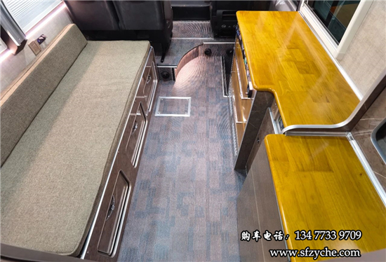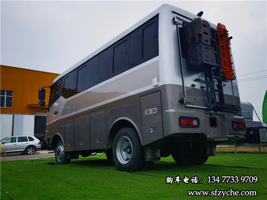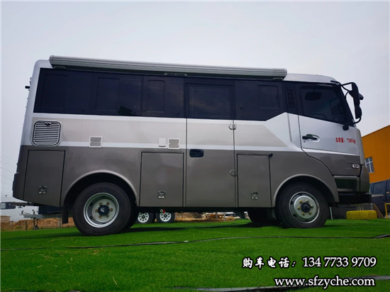 車(chē)身右側(cè)配備了4m的電動(dòng)遮陽(yáng)棚、市電接口、尾部工具箱、戶外照明燈,中置上客門(mén),副駕駛乘客門(mén),車(chē)輛門(mén)鎖均采用越野專(zhuān)用倉(cāng)門(mén)鎖。