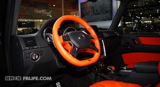 北京車展上的基于G63 AMG 6×6改裝而來的BRABUS 版700G 6 X 6 內(nèi)飾方面,該車采用了黑色和橘黃色的顏色搭配,強烈的顏色反差構(gòu)造出不錯的視覺效果。四幅式真皮方向盤外圈也采用橘黃色真皮包裹,搭配顏色裝飾條,視覺效果極佳。擋把的設(shè)計類似于飛機操作感,上面印有巴博斯的標志,非常具有設(shè)計感。