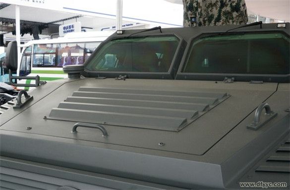 與猛士系列裝甲車動力艙由后向前翻起不同的是,東風四驅防雷反恐戰(zhàn)車的動力艙蓋通過螺栓與合頁固定并由前向后開啟。由上圖可見,前動力艙蓋表面覆蓋5道反向設定的散熱格柵,1只開啟用的拉手。而動力艙蓋兩側車身翼子板(兼顧防護用裝甲板)固定2只吊裝用懸掛。為了提升車輛行駛間的風阻,動力艙蓋向下傾斜;為了提升車輛涉水時近氣安全,在副駕駛員一側前風擋玻璃前部設定可延伸至車頂的涉水喉。