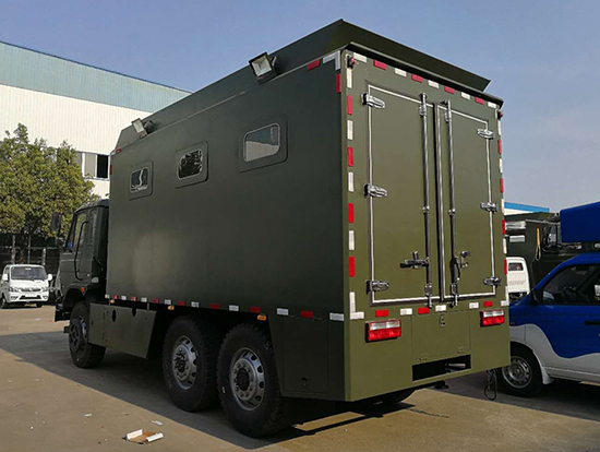 車輛概述:六驅(qū)自行炊事車功能簡介:該裝備主要編配于部隊,為部隊官兵野外作業(yè)時提供良好的飲食保障:具有制作食品、保溫食品和儲存食品的空間與功能、并具有提供開水和餐具消毒的功能。采用東風(fēng)國五越野底盤改裝, 車廂材質(zhì)采用外冷軋鋼板,內(nèi)飾不銹鋼,中間保溫層,隱藏式上車踏步,頂部安全窗,兩個副食灶,一個蒸飯車,抽油煙機,平冷柜,水路,電路,油路等。