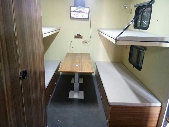 3、休息區(qū)備有4個上下鋪,配有床墊,每個上下床鋪依靠的墻壁上都有一個風(fēng)景透氣窗。每個床鋪下面設(shè)一組附件柜,床位兩側(cè)上方各配衣帽鉤、插座和可調(diào)節(jié)床頭燈,休息區(qū)配有19寸液晶電視一臺及空調(diào)一部。